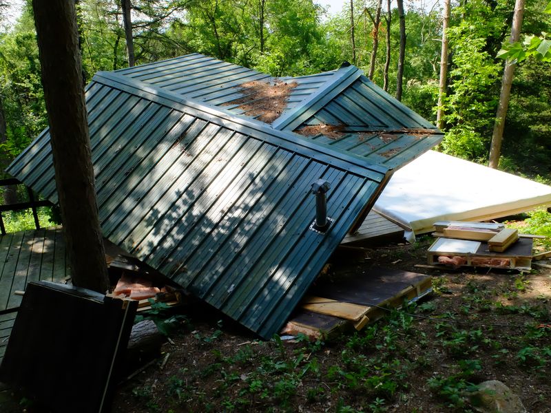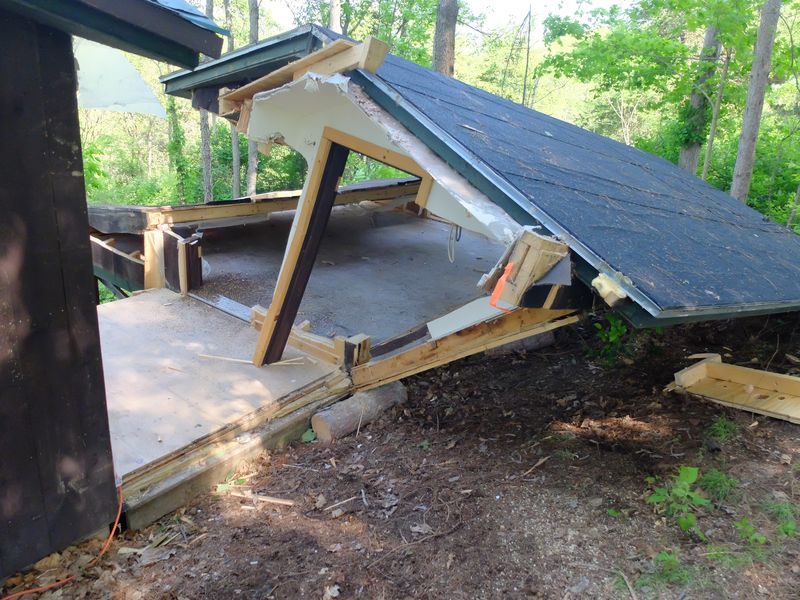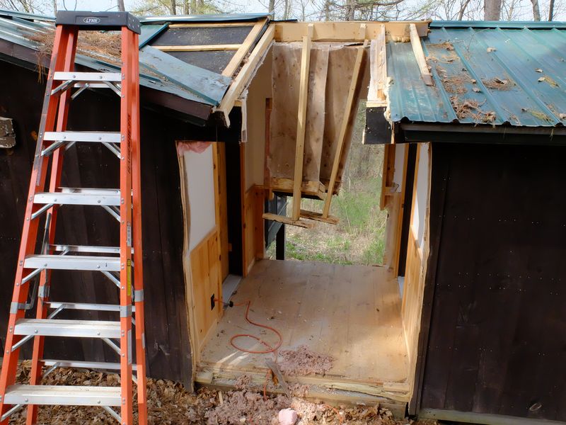 Then I hooked my tractor winch onto one corner and pulled it over. It sort of came down but it saved me from climbing on the rood and it saved me from doing my ceiling demolition inside where it was raining mouse droppings.