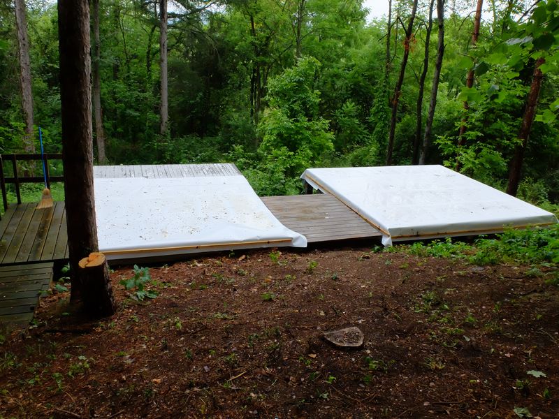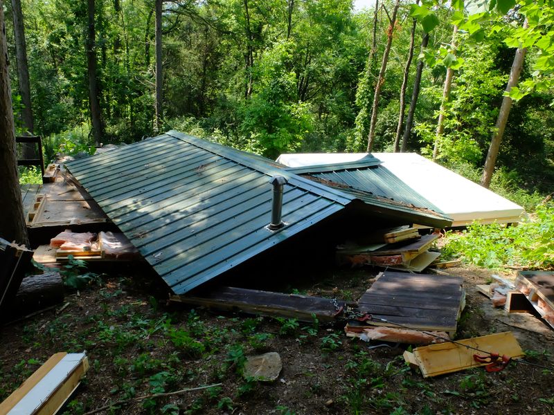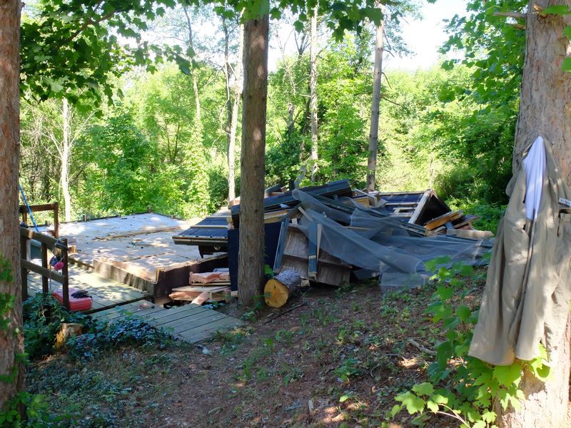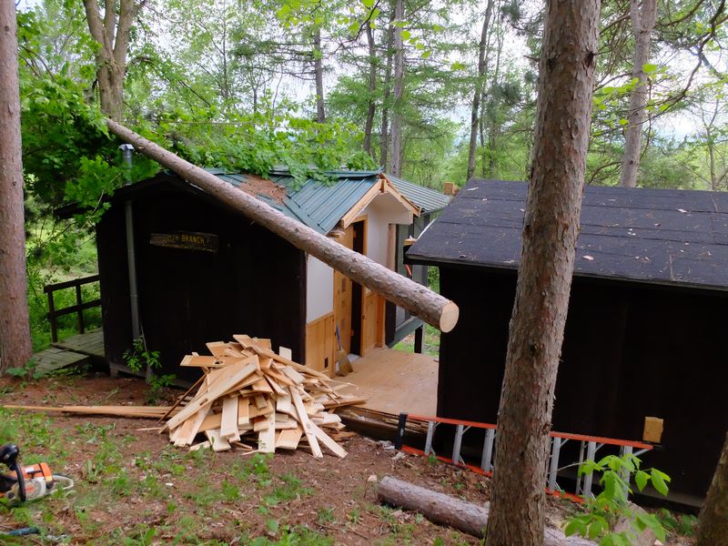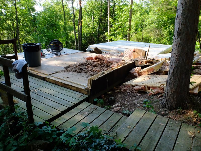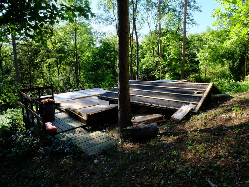 By the end of the summer I had the decks cleared off and covered, and the debris hauled away. I used the tractor winch to drag manageable size pieces up the hill so I could load them into my truck.