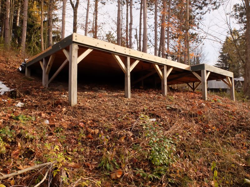 I plan to rebuild as a single room to include both of the old decks, joined together, making a cabin about 28×12. I’ve got new joists and decking to bring the two old decks together.