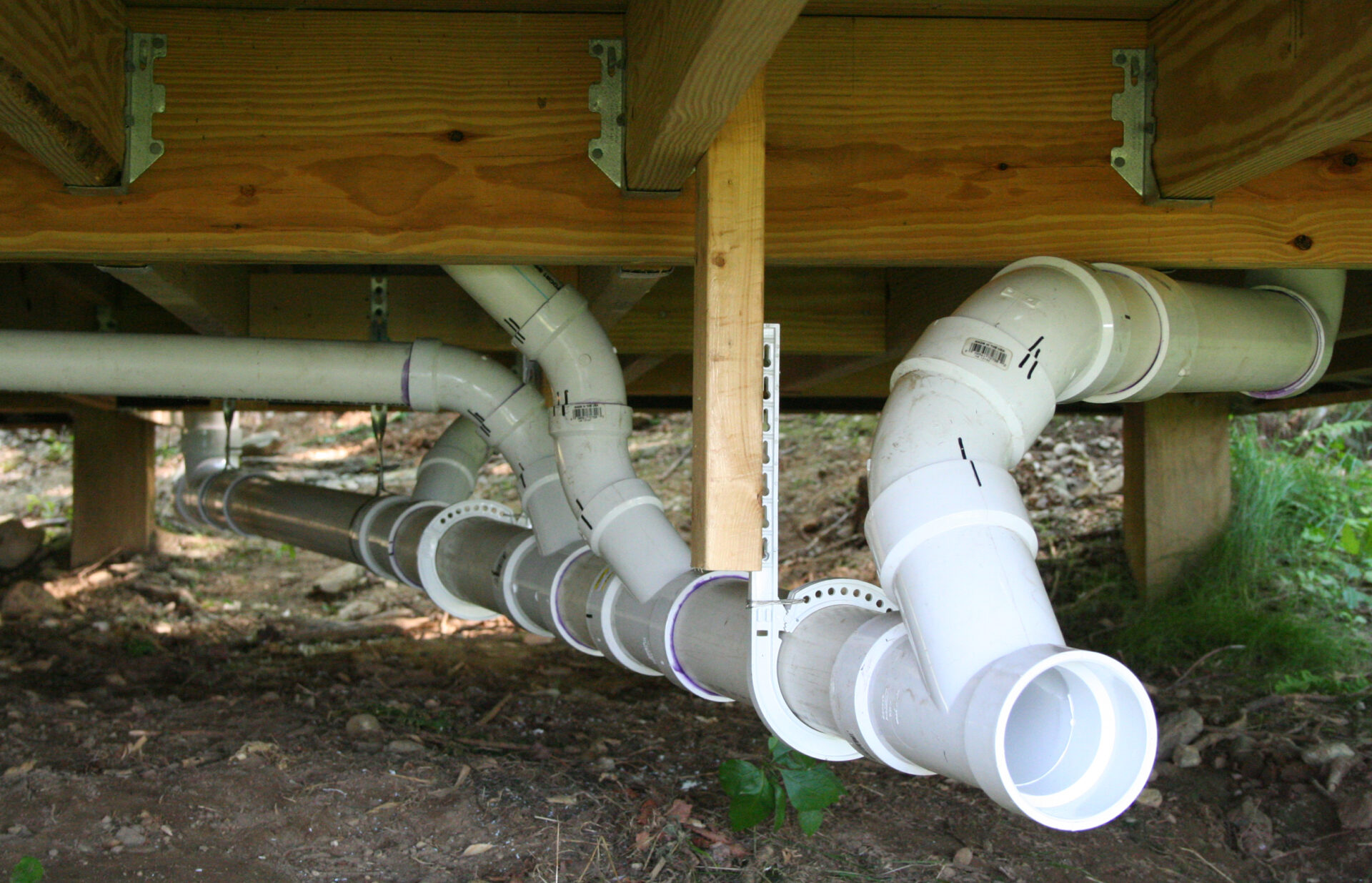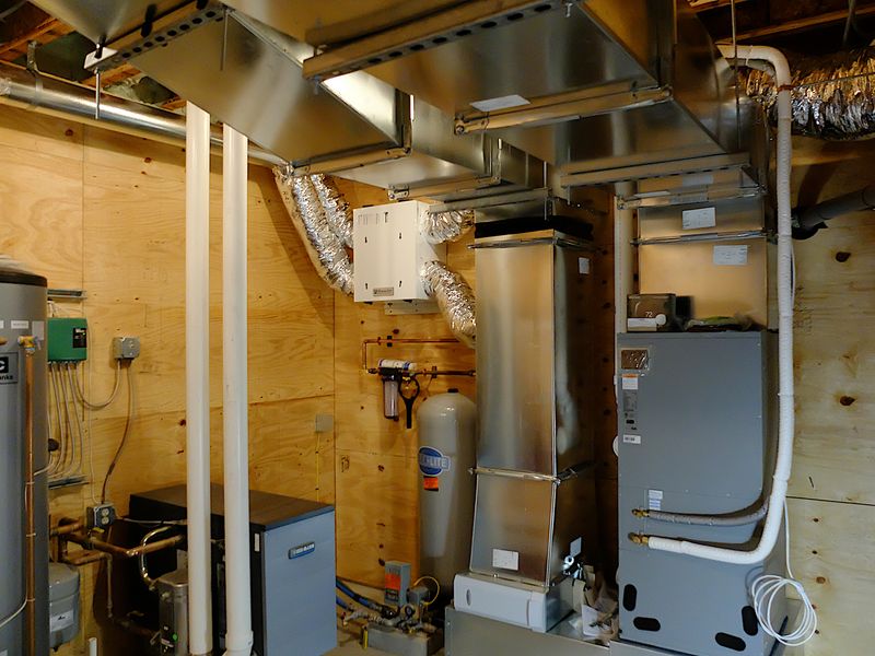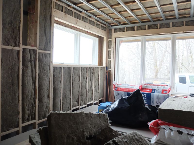 About this time we tried to settle on HVAC. Like the wiring, it was too much for us to plan ahead or make the decision on what kind of system to use before getting the basic structure in place. Initially, we had planned a mini-split heat pump with 2 wall-mounted air handlers and ended up rejecting this solution because a) it didn’t handle the disposal of condensate from cooling without electric sumps, which we thought a liability, b) it didn’t provide for any outside air exchange and c) they tend to be noisy. We ended up with a ducted system with an outside heat pump compressor, interior air handler, acoustically dampened commercial grade ductwork, and an ERV attached to the air handler. The whole system of ductwork is oversized to operate at low volume air flow and thus reduce noise. Below, right to left : air handler, return air plenum, ERV. The ERV differs from an HRV in that ERV’s are supposed to handle moisture exchange as well as heat exchange; whether it does or does not, hard to tell. The ERV takes return air out of the return duct and exhausts it to the outside; incoming fresh air is then dumped back into the return duct downstream of where the exhaust is extracted. The ERV operates according to the programming of the Ecobee thermostat. We have it running 10 minutes every hour, regardless of whether the heat pump is on or off; when the ERV is turned on the air handler is also turned on circulating fresh air.