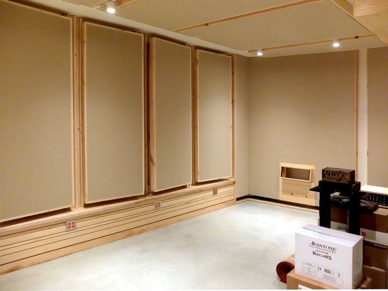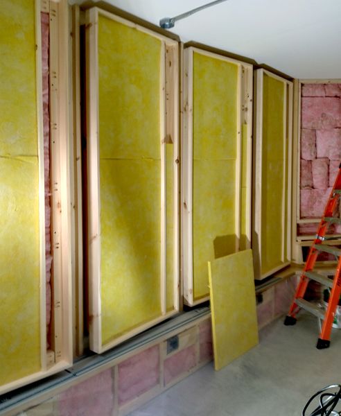 In the control room, the finish walls are built out from the enclosing structure particularly in the corners aka ‘bass traps’ which are filled with normal fiberglass insulation behind the fabric panels.