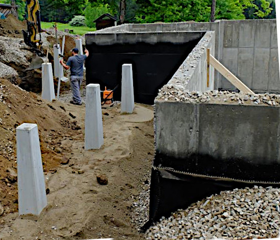 Beginning with the foundation of the house, we took steps to ensure that the basement would be dry. These were to provide damp-proofing to the concrete, cover that with a dimple mat drainage plane like DELTA-MS Below-Grade Foundation Protection, use lots of coarse gravel backfill, and provide perforated collection drains at the level of the footers going out to daylight. The site, being on a hillside, facilitated drainage. In the picture below you can see the damp-proofing, dimple mat and backfill; the drainage pipe is already buried.