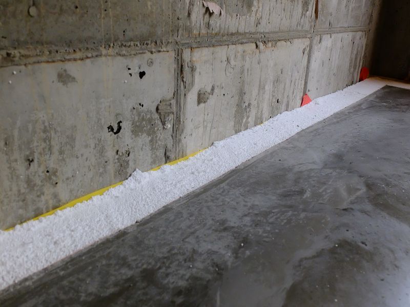 After the slab was poured, we had to go around and cut back the insulation sticking up around the perimeter. Picture of foam after being cut back.
