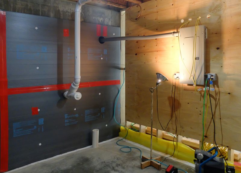 The next step was to cover the entire interior of the foundation with 1-1/4″ XPS foam board, starting with the top, taping all the seams and making our best effort to minimize interior air contact with the concrete to control condensation. After encapsulating the concrete with the foam board, including the top, we had the rim joist spaces spray-foam insulated. This was the only application we had of spray foam in the house. The XPS foam was attached with PL Premium construction adhesive and a minimal number of foam concrete anchors to hold things in place until the adhesive set up. This picture shows a portion of the machine room wall with the XPS attached and taped. You can also see the Stego Wrap and perimeter foam EPS in the floor.