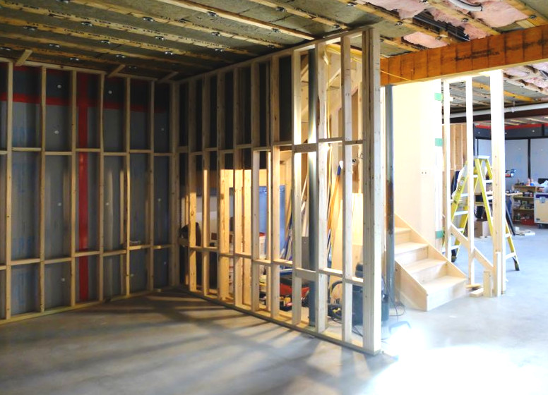Building out the basement of his home as a studio was a 2 year project. Towards the end of the project, we had important assistance from a carpenter friend who handled most of the ‘acoustic treatment’ on the walls and ceilings, but otherwise my son and I did all the work except for the wiring and HVAC system, which were hired out. We are generally well versed in standard construction practices, but there are many peculiarities specific to recording studios and my purpose is to discuss these in this blog for the unlikely few who may be trying to do something similar.
