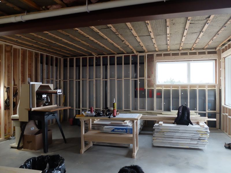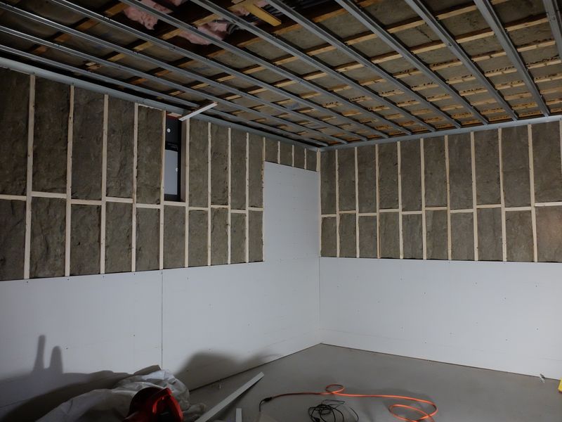 The walls and above-ceiling joist bays were insulated with mineral wool. Hat channel in place connected to perimeter L bracket.