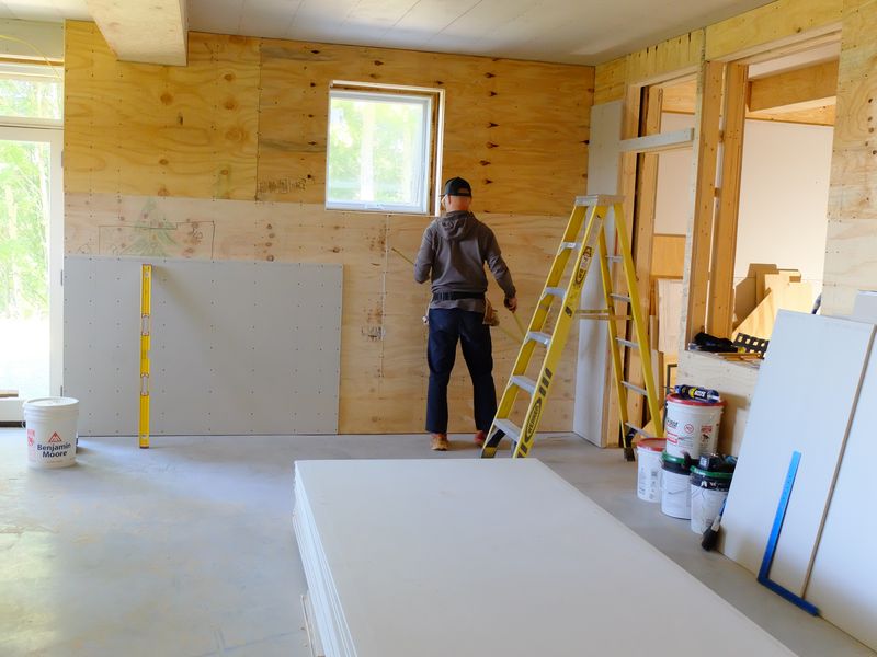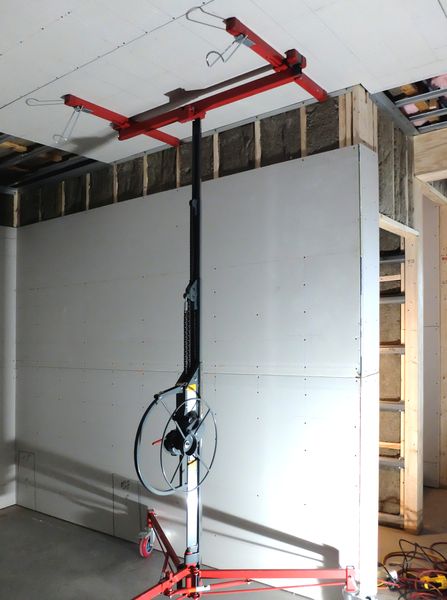 The wall and ceiling panels went on with staggered seams, screw-fastened every 6″, and the sheetrock seams were taped (but not finished) in the underlying layer. A sheetrock lift was absolutely necessary – we bought one for less money that we could have rented it, and sold it for half what we paid when we were done.