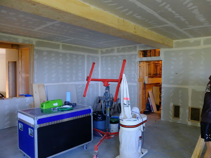 We met several challenges with the clips and metal framing. First, laying out the clips on the ceiling was vastly facilitated by, or, otherwise nearly impossible without, a laser level that projected a plane of light in a vertical dimension along the underside of the joists. Second, it took some serious calculation to assure ourselves that we could hang what became 3-1/2 tons of sheetrock and plywood from the screws which hold the clips to the joists, and that the joists would accommodate the additional load. Thirdly it was somewhat of trial to find which screws worked with the 25 gauge hat channel, when some clearly and badly failed and stripped. The spacing of the clips in our case was 32″ x 24″. The studio is roughly 22′ x 42′ and there are about 344 clips, so each one is carrying roughly 20 pounds; they are rated a 36 pounds for clip spacing 48″ x 24″ so we were good there. Each clip is held to the joint by a #10 x 2-1/2″ GRK construction screw, which meets the design spec, and we had a structural engineer verify that the joists – TJI’s in our case – could handle the load with a maximum deflection of 1/2″. The screws used in the hat channel that worked were like a sheetrock screw, specifically bugle head fine thread streaker point. Self-drilling screws would work in heavier gauge metal framing, but with the 25 gauge channel, self-drilling screws just stripped and failed. The house and studio are hot-water radiant-heat supplied by PEX piping in the ceiling and walls and we were conscious from start to finish about the screw lengths we used and the need to avoid penetration into the wrong places. Below – walls framed, RSIC clips installed, no hat channel. Tube of PL Premium on bench. Piles of sheetrock waiting to disappear.