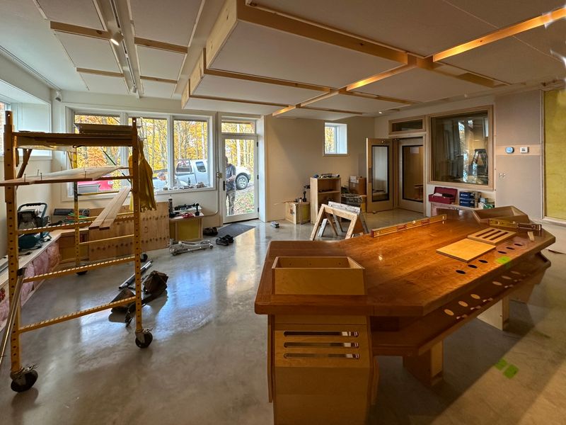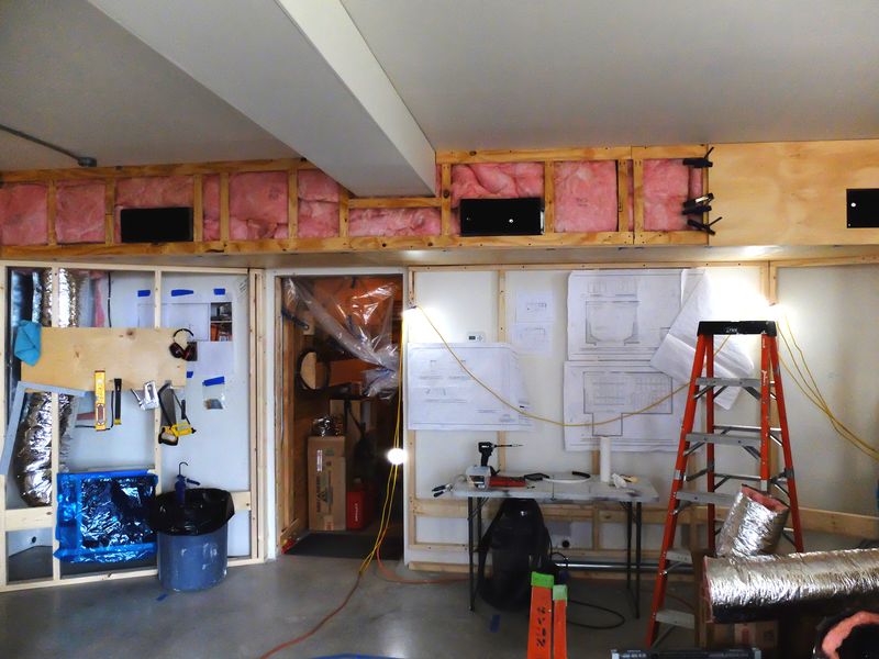 The plywood and sheetrock eventually come to an end. We didn’t realize at that point that about 80% of the ‘finished’ wall/ceiling would get buried under acoustic surface panels, so we (I) spent more time doing a nice clean spackle job in places that will never see the light of day – but – oh well – I remember it as a major personal milestone, almost like graduating from college, when I finished the last inner spackle corner and turned it over to my son to paint.