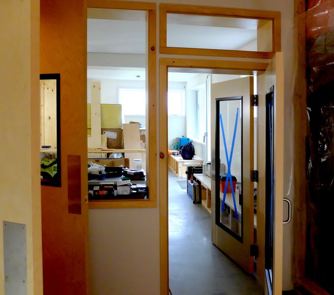 Doors are commercial grade hardwood solid core from CDF. The seals on the stops are a rectangular neoprene with a self-stick backing, and we used automatic door bottoms like the ones from Acoustical Solutions. The double doors and double glazed window, above, provide sound isolation between the control and the tracking room.