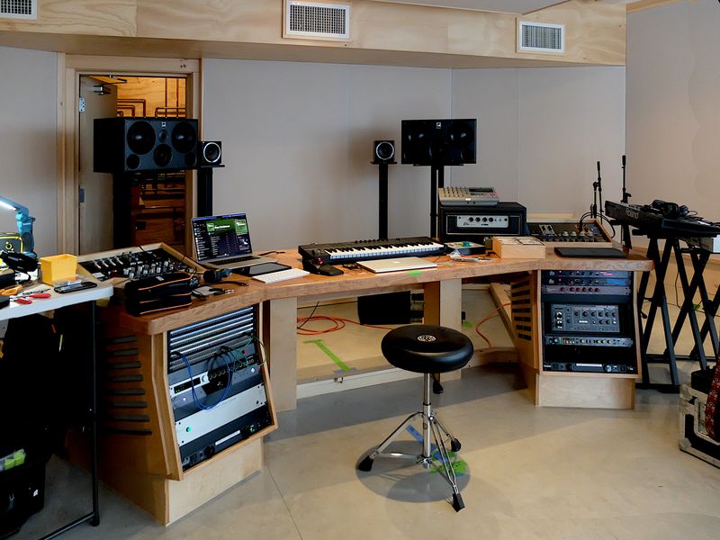 Electrical wiring was a major concern primarily from the point of view of avoiding radio frequency interference (RFI). Without knowing exactly causes or preventions, we knew that buzz happens and can be elusive and/or expensive to track down and fix. The electrical contractors we sought help from were sympathetic but also not experienced in recording studio wiring issues per se. We took advice and precautions that got us a dead quiet system; these were the steps we took: We run all the studio power from a sub-panel attached to the main house panel, and this gives us the option of providing a physical break in the wiring via an isolation transformer (I know, the word ‘isolation’ is redundant here since transformers inherently provide physical wired isolation). We don’t need the transformer now, but can add it easily in the future. We kept power and audio cable physically separate and did not run them in the same conduit. Where power and audio cables had to cross, we tried to make is a 90 degree crossing. We removed all lighting dimmer switches from the house because past experience showed that dimmers running standard LED bulbs can create RFI. The wiring is cable type MC metal clad which inherently provides an electrical shield to ground, and outlets are hospital grade. The house ground is both to outside ground rods and to the foundation reinforcing rod – a Ufer ground.
