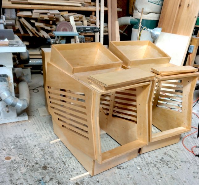 The last major job I had was to build the console. The plans looked like something that should be on the Space Shuttle. We came to like working with 3/4″ Baltic Birch plywood for different things including door casings and I used Baltic Birch for most of the console. The top is made of 2 pieces epoxy-glued together: a 3/4″ cherry finish face and a 3/4″ Baltic Birch backer. Both are WEST epoxy-encapsulated to retard or eliminate moisture transfer and thus cupping/warping, and to date the top has remained flat, as hoped. The pieces on each end are the gear racks where some of the audio and patch panels are located.