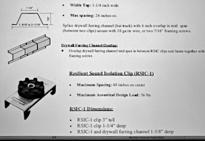 The walls and ceiling are not directly connected overhead to the joists. Instead, they are connected to the metal framing suspended from the joists which holds the ceiling. The metal framing ‘hat channel’ is suspended from sound isolation clips (RSIC clips) spaced every-other-joist in rows 12″ apart, and the hat channel, where it meets the side walls, is attached to an ‘L’ bracket that connects to the walls, tying everything together. These RSIC clips provide acoustic de-coupling between the studio and the surrounding structure.