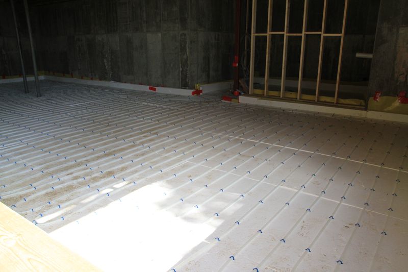 Inside the basement, the slab was poured to include radiant heat supplied via PEX piping. The floor was first leveled with coarse gravel and compacted, then covered with a heavy poly vapor barrier of STEGO® WRAP VAPOR BARRIER (15-MIL). The seams in the Stego Wrap were sealed with waterproof tape, and the wrap was brought up the side walls above what would be the top of the slab. The poly was covered with 3″ EPS foam insulation board to which the PEX tubing was stapled. The foam board was wrapped around the perimeter to finish higher than the top of the slab.